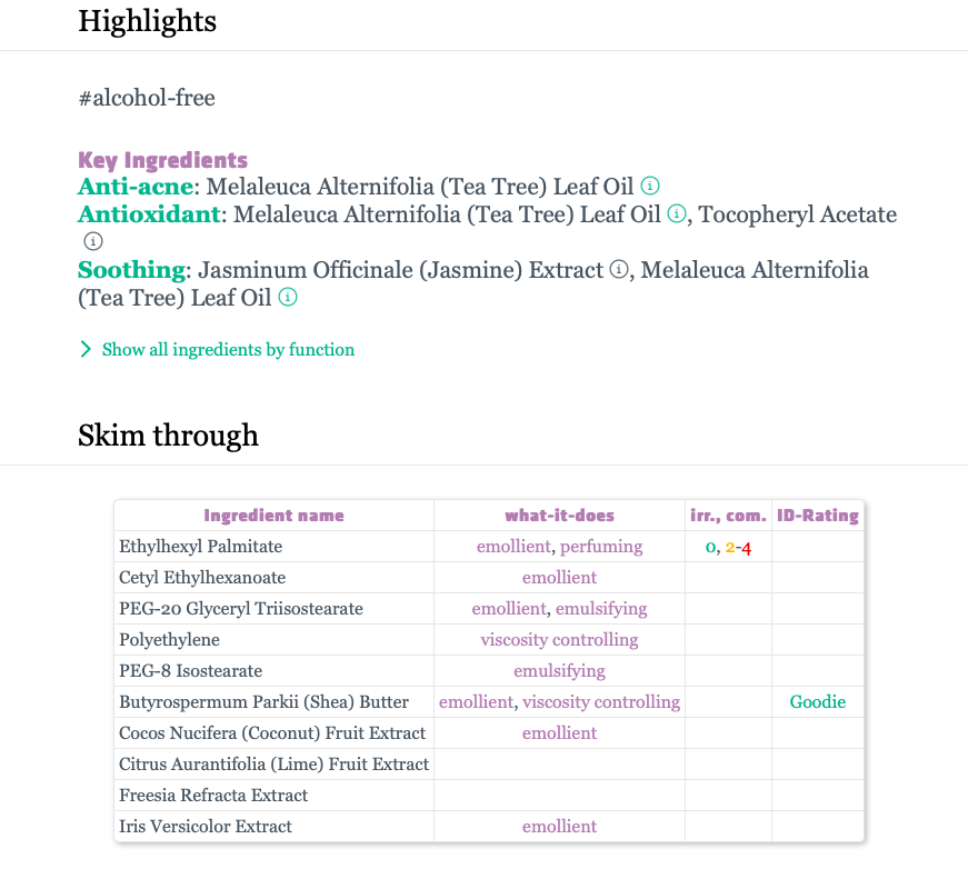Here’s a screenshot of the ingredient highlights from INCIDecoder’s page: